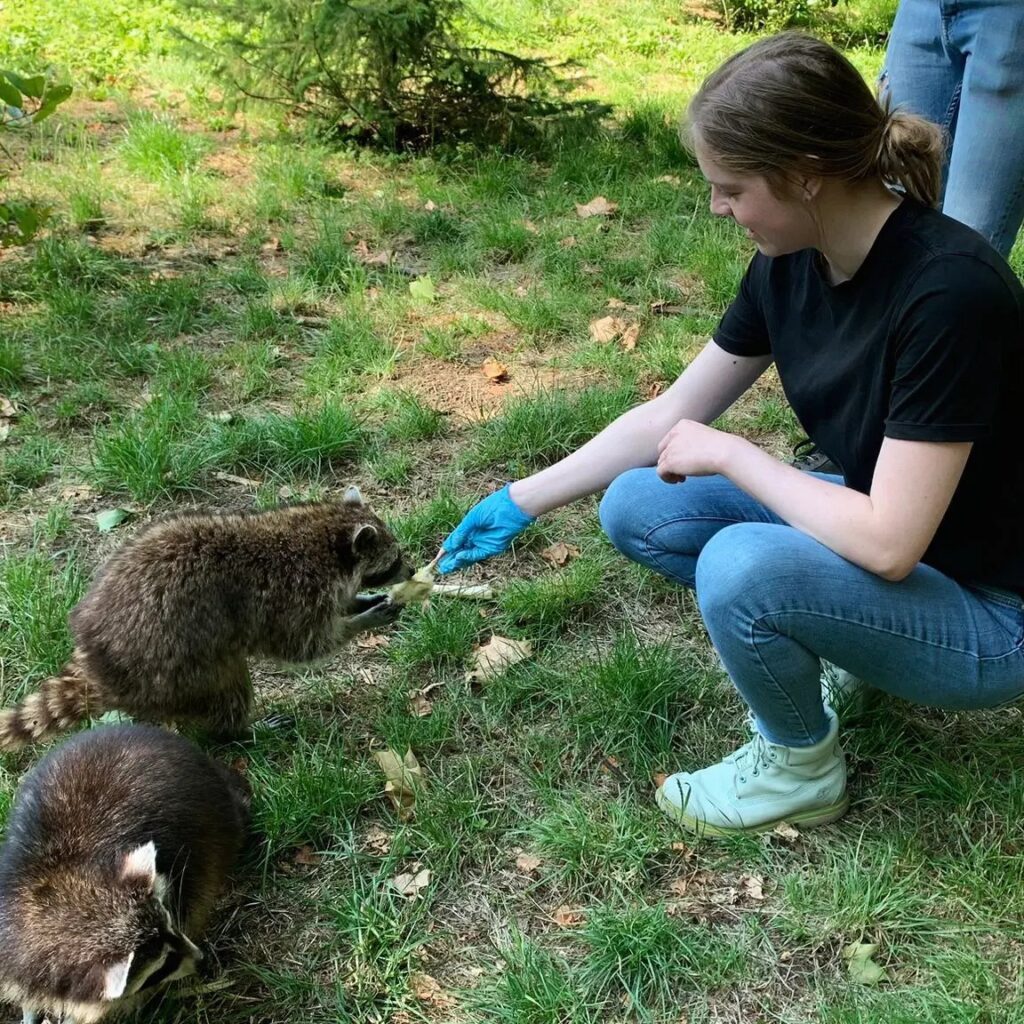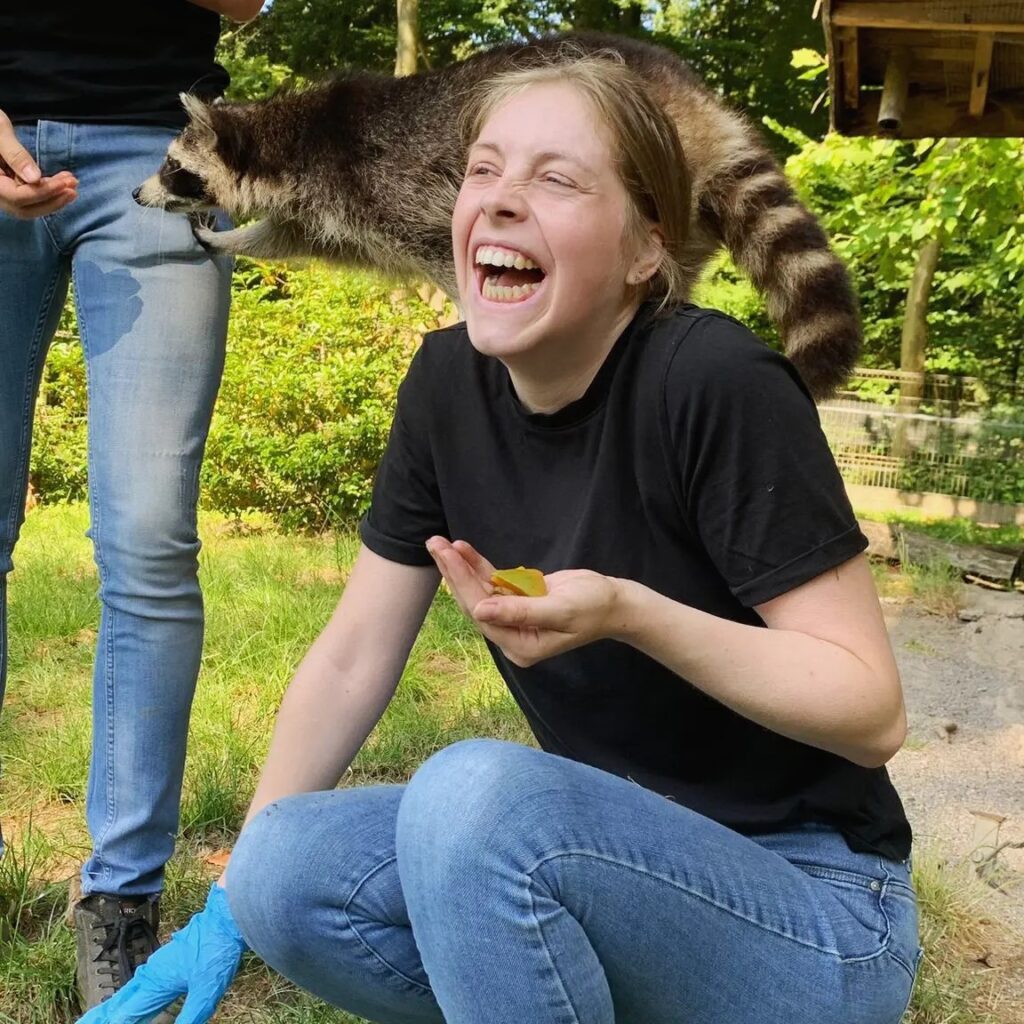Voor we erin gingen werden we gewaarschuwd dat wasberen erg nieuwsgierig zijn en zo op je kunnen klimmen. Dat hebben we geweten. Je kon de wasberen gewoon uit de hand laten eten en ze pakte het dan uit je hand. Het eten wat ze kregen waren: hondenbrokken, verschillende soorten groente en fruit, stukjes hart en kuikentjes. Ze doen alles voor eten. Aan het eind hebben we even een rondje door het verblijf gelopen om de poep op te ruimen, dit hoort er natuurlijk ook bij.